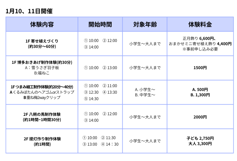 かるた・お手玉・けん玉などの昔ながらの遊びや、博多人形の絵付け、つまみ細工、寄せ植えづくりなど多彩なワークショップを通して、日本の正月文化を楽しめます。親子で参加できる体験が充実しています。(参加は無料一部体験は有料・要予約あり)。